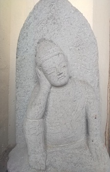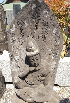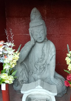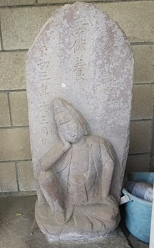 国道1号線新湘南バイパスの南側、茅ヶ崎市との境界近くにかつて宗賢院の末寺だった深勝寺がありました。今は墓地だけが残っています。この個人墓域に別法一心との造立者名が刻まれている如意輪観音塔が見られます。同じ墓域に別法一心首座とある地蔵菩薩塔があり、ほかにも阿弥陀三尊をあらわす三塔(阿弥陀如来、聖観音菩薩、勢至観音菩薩)に法主、庵主とある法名がみえるので、深勝寺とゆかりの深い旧家なのでしょう。二臂の如意輪観音像は素朴ながら状態がよく、文字もきれいに残っています。
