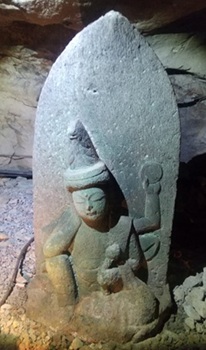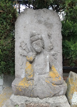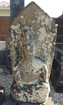 石川の共同墓地の個人墓域にあるこの塔は、典型的な多臂如意輪観音像に見えます。造立年代もこれまでとりあげた多臂像と一致します。ふくよかな人間的な顔立ちで、彫りも立体的な立派な墓塔です。しかしよく見ると左は三手あるものの右は二手しかありません。五臂です。おそらく胸のところに失われた一手があったのでしょう。それは宝珠を持っていたと思われます。しかしこれだけしっかり彫られていて状態もよい像から一手だけがきれいに欠落するというのもやや不思議な気がします。
