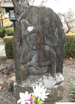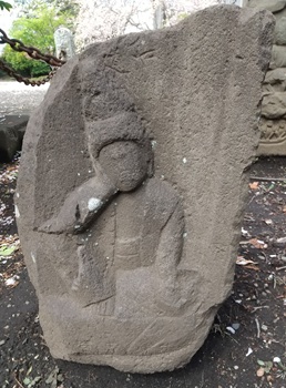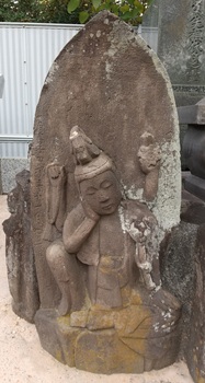 藤沢の伊勢山公園の頂上付近には庚申塔がいくつか散在していますが、その中に如意輪観音像が彫られた石塔があります。左側の欠損が激しく元の形状は不明です。右面には猿の像が見られるので庚申塔だったのかもしれませんが、そうだとしたら如意輪観音を主尊とする庚申塔は非常に少なく、神奈川県に三基しか知られていないとの報告があります(こちら)から、四基目になります。正面と思われる上部に「道」の字が見えるのは道標を兼ねていたのでしょうか。