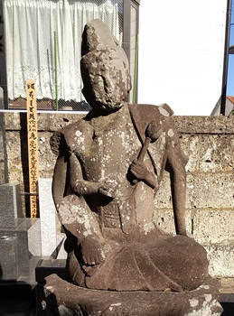 これは同じ遠藤宝泉寺の境内にある念仏塔で、以前こちらで紹介したものです。素朴な六臂像で人間的なふっくらとした顔立ちが特徴的です。この塔の右隣に同じく西誉浄円が願主と刻まれた二千日総回向の六面幢があるので、この塔も何千日総回向とあったのでしょう。また左隣にはやはり同時期の念仏塔が置かれていますが、宝泉寺は禅寺ですからこれら三基は元は別のところにあったと考えられます。遠藤に浄土宗寺院が存在したとの記録はなく、これらの僧がどこからやってきたのかは謎のままです。